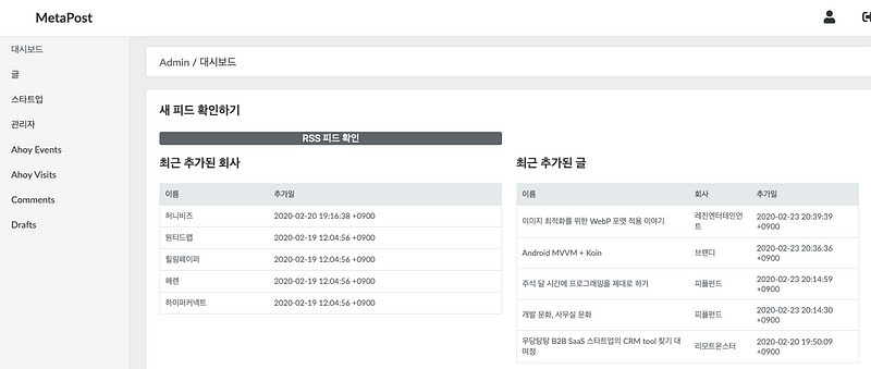 그리고 관리자 페이지를 가지게 되었습니다. 짧은 시간에 원하는 기능들을 만들기 위해 Ruby on Rails를 이용했습니다. 사용자가 많지 않고, 잘 만들어진 라이브러리를 이용해 빠르게 만들 수 있었습니다.