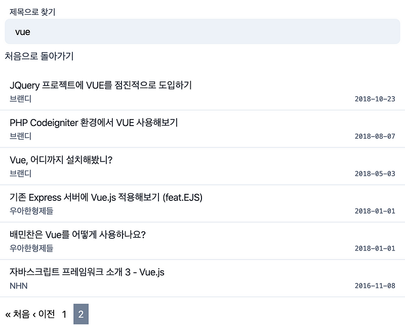 “읽고싶은 주제의 글을 찾을 수 없어서”의 경우는 조금 다릅니다. 궁금한 주제 (예를 들면 Vue)를 찾으려면 페이지를 넘겨가면서 Vue를 다루는 글이 있는지 일일히 눈으로 확인해야합니다. 16개의 글이나 Vue를 다루고 있음에도 페이지를 꽤나 넘겨야 합니다.
