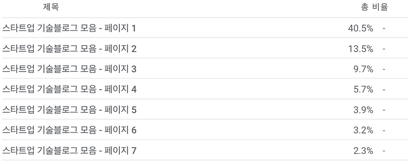 현재 스타트업 기술 블로그 모음에는 총 1523개의 글이 있습니다. 페이지별로 10개, 152페이지까지 있습니다. 3번째 페이지부터 접속이 줄어들고 7페이지에 다다르면 2%의 사용자만 남습니다.
