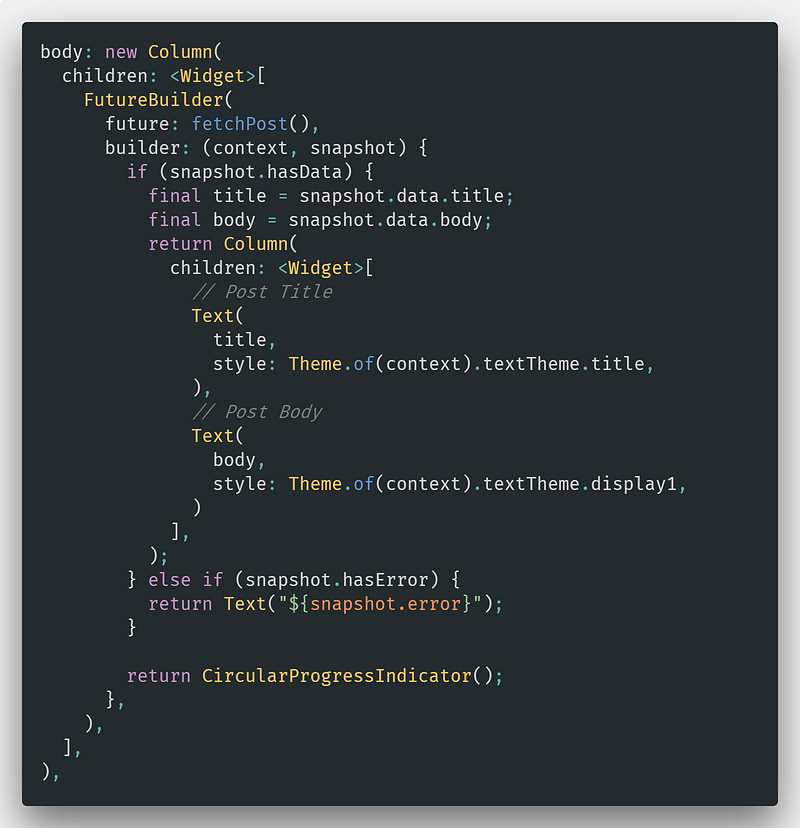 Scaffold 클래스의 body 속성 전체입니다. FutureBuilder를 이용해 Future를 실행하고, 응답 결과인 snapshot의 상태에 따라서 다른 화면을 표시합니다. 아직 Future가 종료되지 않았다면 CircularProgressIndicator를 출력합니다. snapshot을 사용하는 코드를 통해 비동기 응답을 처리하는 부분을 확인하시고, Column과 Column의 children 속성을 이용해 화면 레이아웃을 구성하고 있습니다. 변경사항은 이 커밋을 확인하세요.