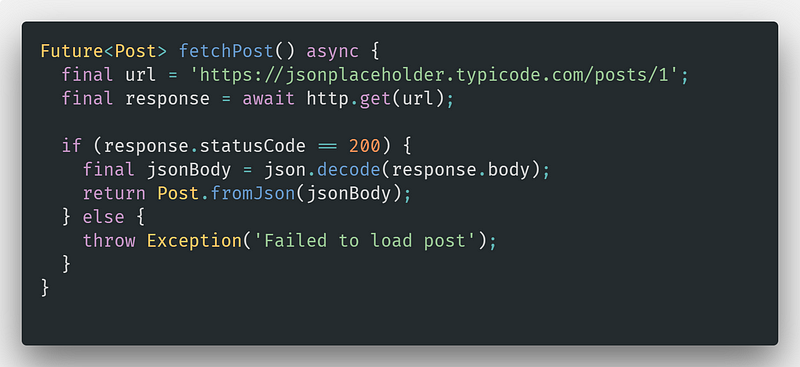 응답이 성공하면 json.decode로 응답의 body를 JSON으로 만들고 Post 클래스에서 만든 fromJson 메소드로 초기화합니다.