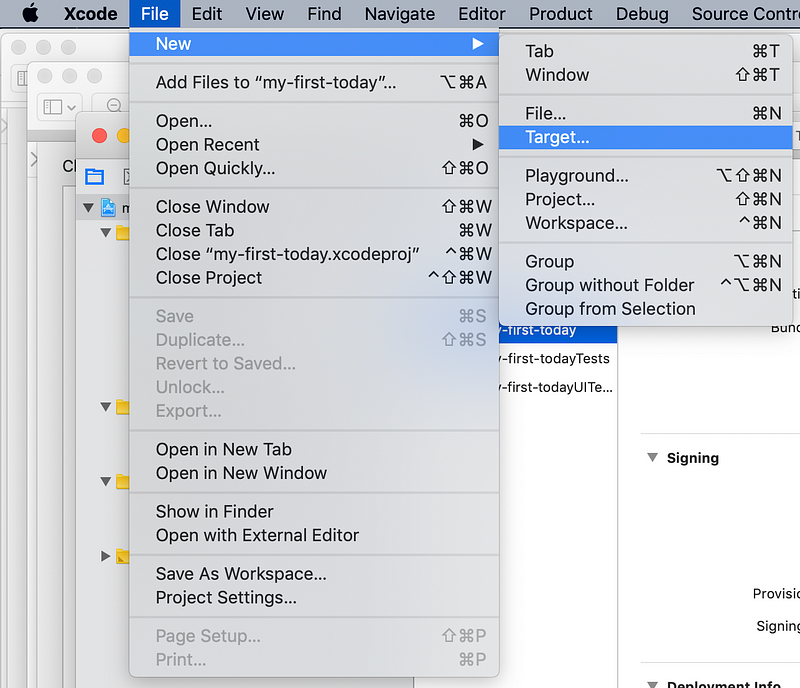 File -> New -> Target을 눌러 새로운 앱 타겟을 추가합니다.