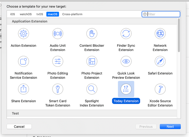 여러 Application Extesion이 있는데 여기서 Today Extension을 선택합니다. 자세히 나와있는 정보가 없어서 Action Extension 등을 선택했는데 작동하지 않았습니다.
