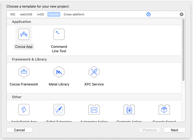 Xcode를 켜고 macOS / Cocoa App을 선택합니다.