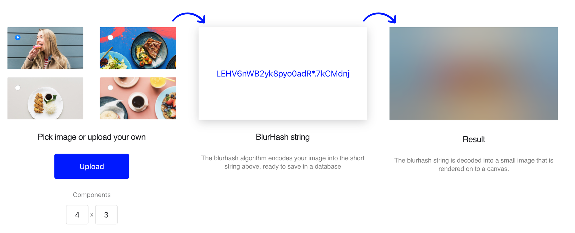 서버에 이미지와 Blurhash 문자열 LEHV6nWB2yk8pyo0adR*.7kCMdnj 을 함께 저장한다. 앱에서는 Blurhash 문자열을 이용한 흐릿한 이미지를 먼저 보여주고 Fade In 효과와 함께 원본 이미지를 가져오도록 할 수 있다.